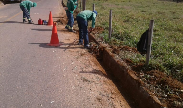 Os serviços de conservação rodoviária compreendem ações contínuas de manutenção das vias, incluindo roçada das faixas de domínio, limpeza e desobstrução de dispositivos de drenagem, além da execução de tapa-buracos para correção de patologias no pavimento. As intervenções visam garantir a segurança viária, melhorar a visibilidade e as condições de tráfego, preservar a infraestrutura existente e prolongar a vida útil das rodovias.